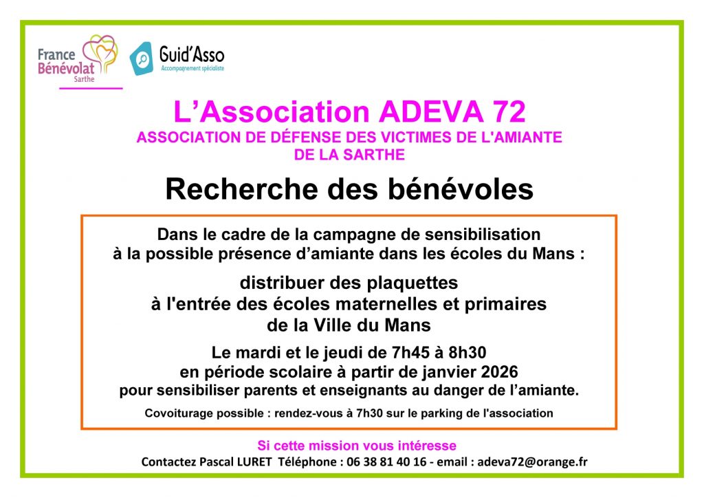 ADEVA (Association de défense des victimes de l'Amiante de la Sarthe) Bénévolat régulier : distribuer des plaquettes à l'entrée des écoles maternel...